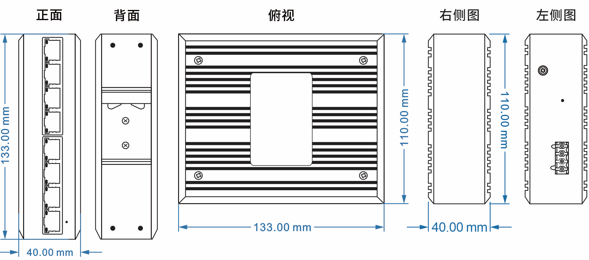 DC電源: 冗余雙電源輸入DC9-70V ,功耗<5W 過載保護:支持;反接保護:支持;冗余保護:支持 接入端子:4芯5.08mm間距插入式端子 |