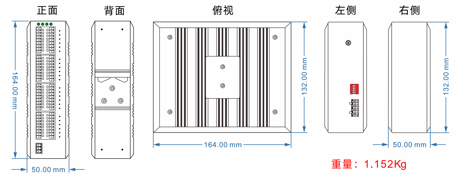 | 產(chǎn)品尺寸 | 外殼:IP40防護(hù)等級(jí),鋁合金材質(zhì) 尺寸:164mm(長(zhǎng)) x 132mm(寬) x 50mm(高) 安裝方式:導(dǎo)軌安裝、壁掛式安裝 |